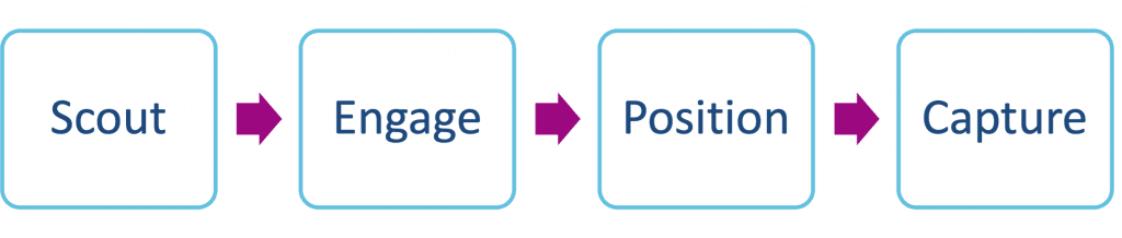 Building trusted, longer-term and profitable client relationships requires improved capacity in managing customer knowledge, i.e. knowledge about as well as from and for customers, reinforced by value creation and thought‑leadership. It is created on a foundation of trust, listening, and service to our clients – one building block at a time. Over time, and through multiple client contacts, the relationship strengthens. This journey occurs in four phases of STRT and toward becoming the client’s preferred provider: Scout, Engage, Position, and Capture.